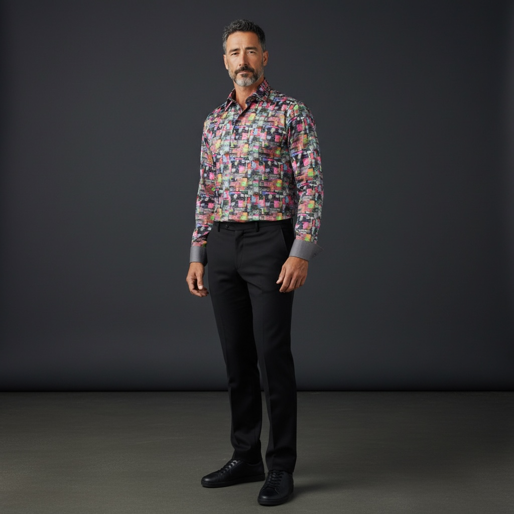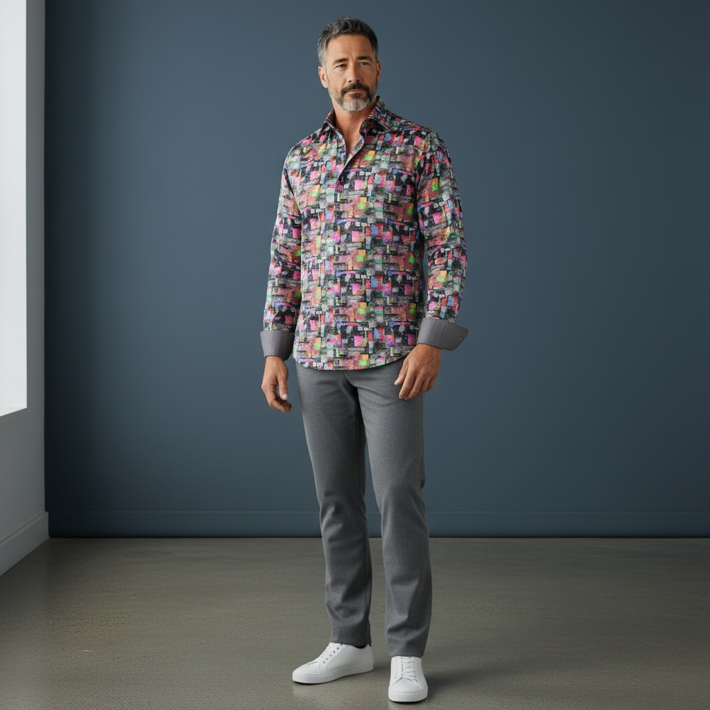 Ein buntes, asymmetrisch kariertes Hemd für einen mutigen und modischen Look.