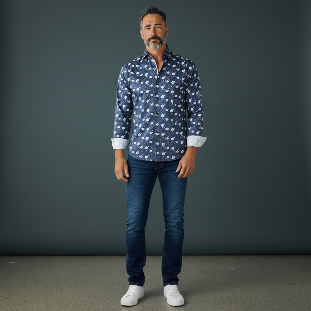 Ein Hemd mit einem einzigartigen blau-weißen Uhrenmuster, ideal für jeden Anlass.