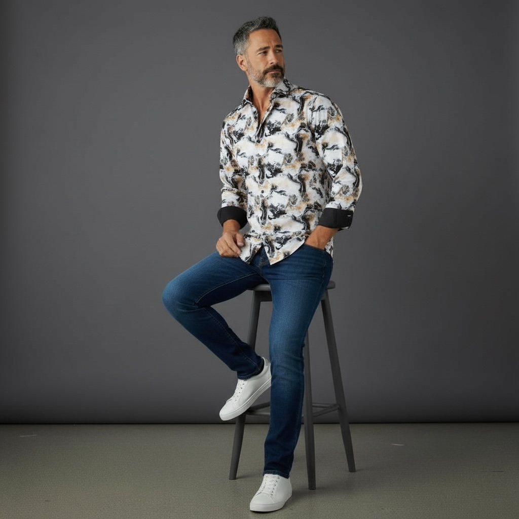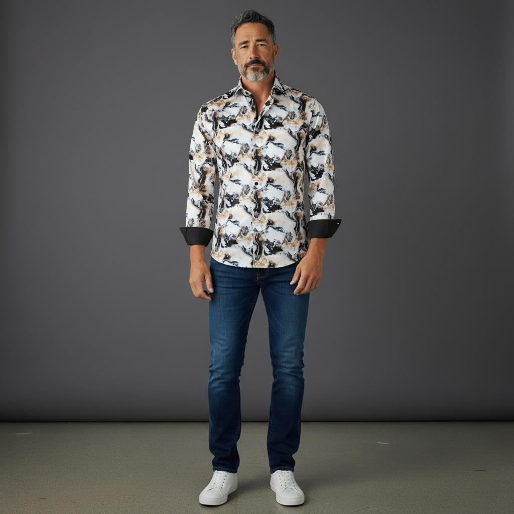 Ein modisches Hemd mit Marmordesign, das jedem Outfit einen Hauch von Eleganz verleiht.